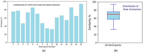 The similarity between the sensors is calculated by comparing the number of detected peaks in each dataset (a). The evaluation determines the wireless sensor’s potential for usage in dynamic environments. The distribution of peak similarity scores across all participants shows a mean of 66.17%, a median of 69.85% (red line), and a standard deviation of 17.26% (b).