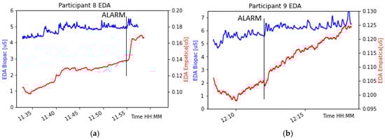 Both sensors effectively captured the data, demonstrating a rise in participants’ arousal in response to the alarm. (a) The differences in the absolute signal values are generally due to the different types of electrodes used and largely because of the density of sweat glands on the skin where the electrodes are placed; (b) Performance of the wireless sensor was affected by body hair on participants’ hands, with weak electrode–skin contact resulting in very low conductance.
