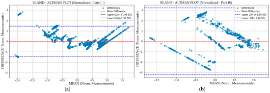 The mean differences for all participants in Table 1 are close to zero, indicating minimal systematic bias between the sensors, suggesting that neither sensor consistently overestimates nor underestimates measurements compared to the other. The standard deviations of the differences range from approximately 0.7426 to 1.6627, which reflects the variability in agreement across the datasets. The limits of agreement (LOA) provide the range within which 95% of the differences are expected to lie, varying across sheets, with narrower ranges, such as those for participants 1 and 5, indicating higher agreement, and wider ranges, such as those for participants 9 and 10, reflecting greater variability, as illustrated in Figure 11.