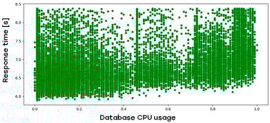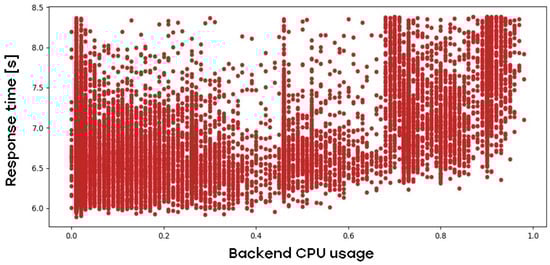 Understanding the dataset was an essential initial step in this process. Statistical analysis elucidated its structure and pinpointed potential issues that could impede the neural network’s performance. The dataset’s performance was examined under different load conditions, uncovering trends in response times. The average response time was 6.73 s, which escalated with increasing CPU load on the frontend, backend, and database nodes. The backend node demonstrated the most significant effect. Moreover, the utilization of SSDs demonstrated marginally quicker application response times relative to HDDs; however, the practical distinction was minimal. These findings emphasized the significance of hardware configuration in system performance. The average response time can be seen in Figure 2: