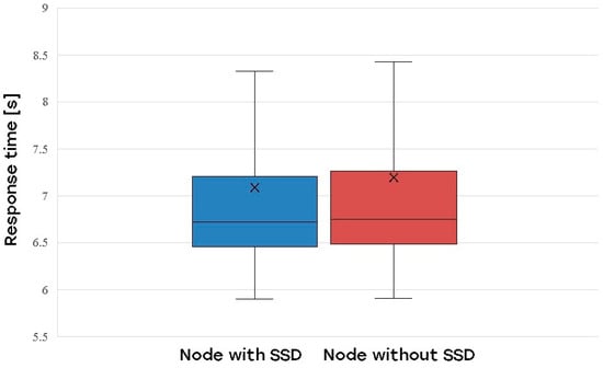 As described in Section 4, nodes with and without SSD were also considered. Figure 6 illustrates the impact of SSD on the web application response time: