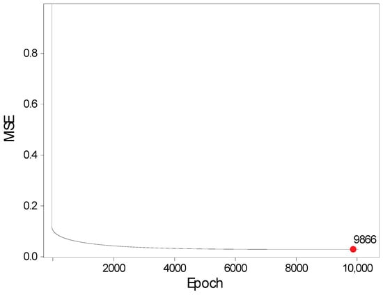 After finding the optimal values of the hyperparameters, the next step was to find the optimal number of epochs. This was performed by starting the learning process with 10,000 epochs and then looking for the epoch that contains the least MSE. It can be seen that MSE has already experienced a steep decline in the first few epochs, and after 1000 of them, the values are already less than 0.1. The lowest MSE recorded is 0.0266 at the 9866th epoch, as can be seen in Figure 7: