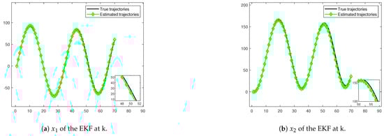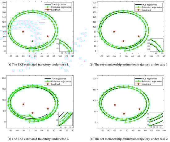 Additionally, the proposed method in this paper is compared with the Extended Kalman Filter (EKF) approach. The process noise and observed noise covariance matrix of the extended Kalman filter is and . In order to effectively compare the EKF with the methods in the manuscript, the noise zonotope matrix is set up according to the normally distributed principle, and . The accuracy of the two algorithms is compared by calculating the average Euclidean distance error , where is the number of Monte Carlo experiments. The three landmark positions in the algorithm are (−20,80), (10,40) and (60,60).