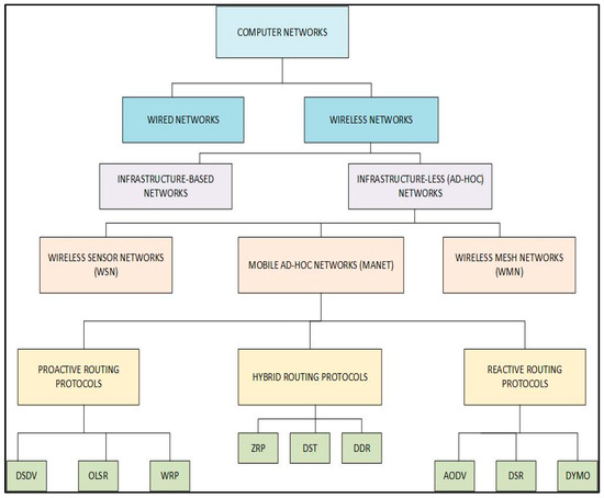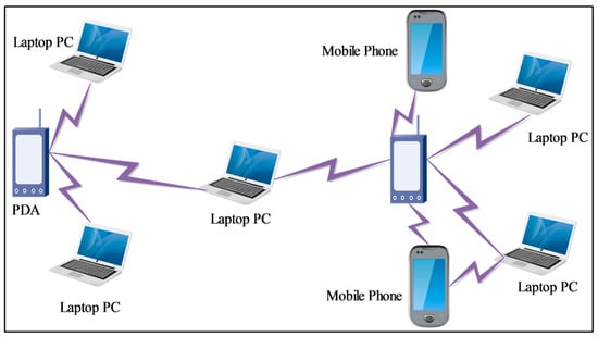 Ad hoc networks are categorized into wireless sensor networks (WSNs), wireless mesh networks (WMNs) and MANETs. A MANET is a network where the mobile nodes are in communication with one another without administration assistance [11,12]. Instead of having an access point, a wireless device connected to the network can act as a centralized router with access point software. In these networks, routing is needed to find a suitable path from a source node to its destination with the help of routing protocols.