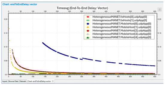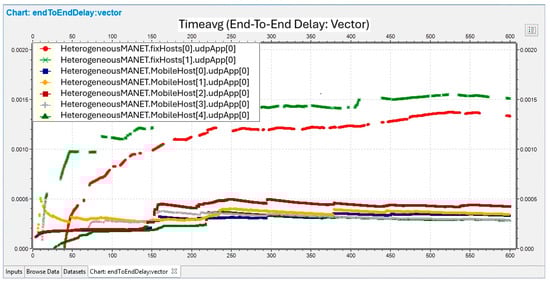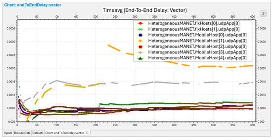 The effect of various node types on the end-to-end delays for the OLSR routing protocol is depicted in Figure 6. Throughout the simulation, the delays exhibit a gradual increase and eventual stabilization, illustrating the protocol’s ability to maintain consistent communication despite the mobility of the nodes. The performance differences among the heterogeneous nodes highlight OLSR’s strengths in managing routing efficiency in dynamic environments.