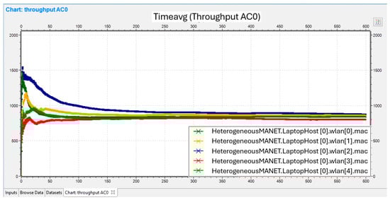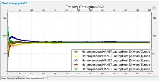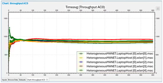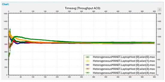 To evaluate whether the observed differences in the protocol performance metrics are statistically significant, we conducted an ANOVA test at a 95% confidence interval. The results indicate that the protocol selection has a statistically significant impact on the throughput (p < 0.05), end-to-end delay (p < 0.01), and packet delivery ratio (p < 0.05). This analysis confirms that the performance variations observed in our simulations are not random fluctuations but meaningful differences attributable to the design and behavior of the routing protocols under study. By incorporating statistical testing, we ensure that our conclusions are robust and applicable to real-world MANET deployments. The throughput performance of the laptop nodes utilizing the AODV routing protocol is illustrated in Figure 7. Throughout the simulation, the throughput stabilizes at approximately 1000 kbps, demonstrating the protocol’s capacity to efficiently manage data transmission across heterogeneous nodes. The consistent performance across different laptop hosts highlights AODV’s effectiveness in maintaining robust communication in varied network conditions.