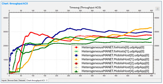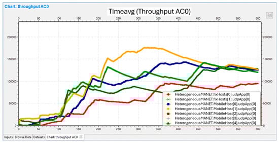 The effect of the mobile nodes on the performance of the OLSR routing protocol is shown in Figure 18. Throughout the simulation, there is a steady increase in throughput for the mobile nodes, although there are some fluctuations because of dynamic changes in the network topology. OLSR’s proactive nature helps to maintain relatively consistent throughput, despite the mobility of the nodes, reflecting its efficiency in routing updates and maintaining network stability.