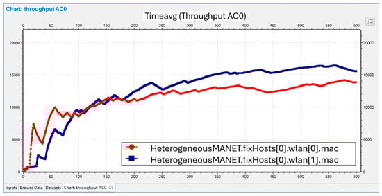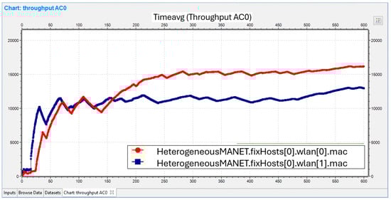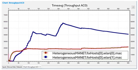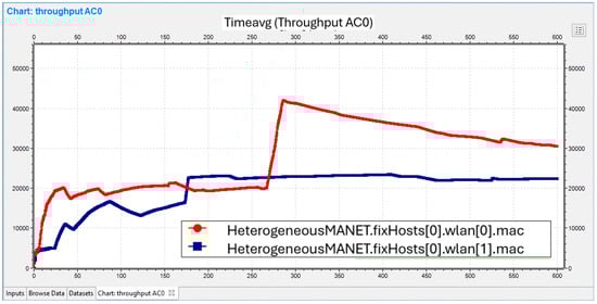 The effect of the fixed nodes on DYMO’s throughput is shown in Figure 15. The blue node exhibits significantly higher throughput compared to the red node, stabilizing after approximately 150 s. This result emphasizes DYMO’s capacity to maintain efficient routing for fixed nodes under heterogeneous conditions. In summary, DYMO maintains stable throughput even as the node mobility increases, unlike AODV. It outperforms the other protocols in delay and throughput, making it ideal for networks where devices move unpredictably.