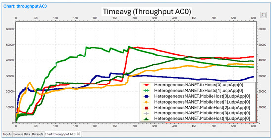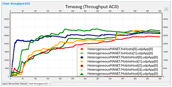 The effect of the mobile nodes on the throughput performance of the DYMO routing protocol is shown in Figure 14. The graph shows a significant increase in throughput as the simulation progresses, particularly between 50 and 200 s, where the network stabilizes. The variance in throughput across the different mobile hosts is reflected in the varying mobility levels and traffic loads within the network. After 200 s, the throughput becomes more stable, indicating effective route management by DYMO in dynamic conditions, although slight fluctuations can still be observed toward the end of the simulation.