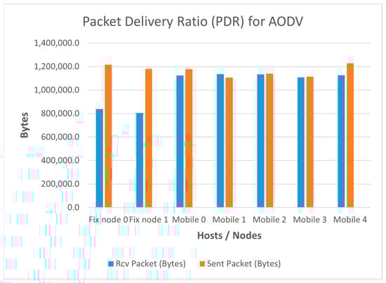 In this section, we present the packet delivery ratio (PDR) performance for all four MANET routing protocols that we considered in this study. The PDR is defined as the ratio of the number of packets successfully delivered to the destination to the total number of packets sent by the source. The UDP packet size was set to 512 bytes. Packet loss was primarily caused by wireless loss, which was modeled using a combination of free-space path loss and Rician fading to account for the mobility of the nodes. The buffer overflow was minimized by setting the buffer size to 64 KB per node. Figure 19 shows the PDR for the AODV routing protocol across various node types, including both fixed and mobile nodes. The chart highlights the consistency of the PDR between the sent and received packets for mobile hosts compared to fixed hosts, with only minor variations observed. AODV performs well in terms of maintaining a high PDR, particularly for mobile nodes, emphasizing its effectiveness in dynamic network environments.