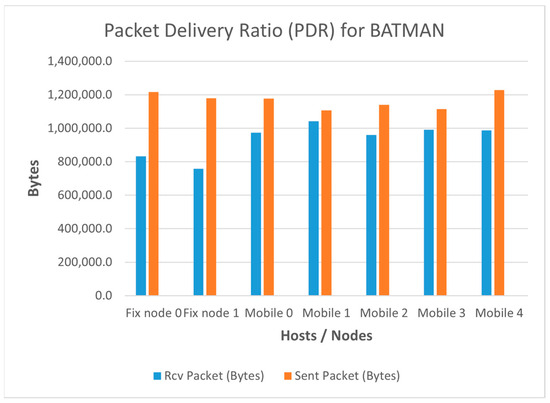 Figure 20 focuses on the PDR for the BATMAN routing protocol. As with AODV, the mobile nodes generally show a slightly better PDR compared to the fixed nodes. However, the differences between the fixed and mobile nodes are more pronounced in the case of BATMAN, with the mobile nodes consistently achieving higher sent and received packet values. This result emphasizes the effectiveness of BATMAN’s approach in managing packet delivery for varying mobility conditions, with the mobile nodes being better equipped to handle dynamic topology changes. Despite this, the overall PDR remains consistent across both the fixed and mobile nodes, highlighting BATMAN’s robustness in diverse environments.