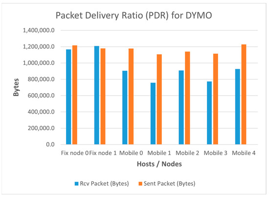 Figure 21 shows the PDR for DYMO for various node types. The PDR is relatively consistent across both the fixed and mobile nodes, showing minimal variance in the sent and received packets. This indicates the reliability and efficiency of DYMO in maintaining data delivery across diverse network configurations.