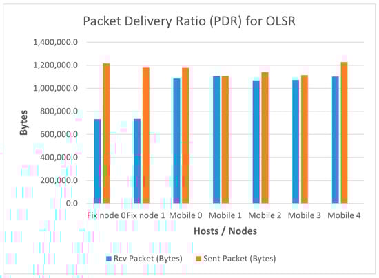 Figure 22 illustrates the PDR for OLSR across various fixed and mobile nodes. The graph shows a stable PDR with minor variations between the sent and received packets for the different nodes, indicating OLSR’s efficiency in maintaining reliable packet delivery across the network, especially for mobile hosts.