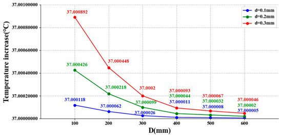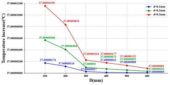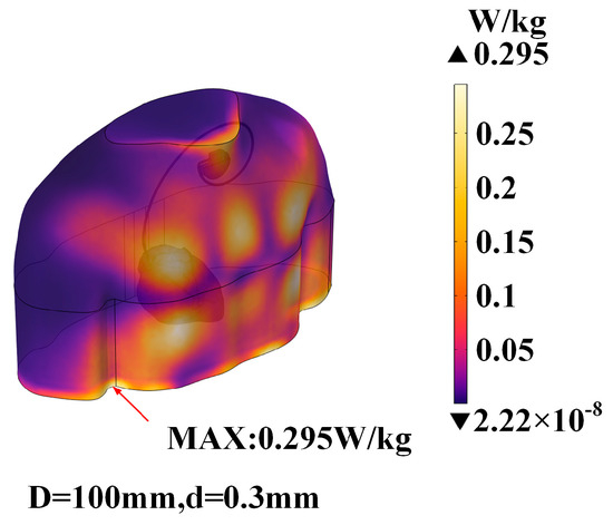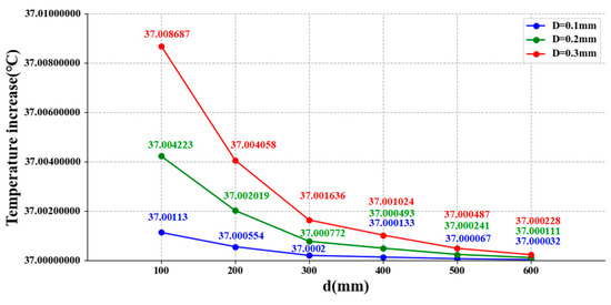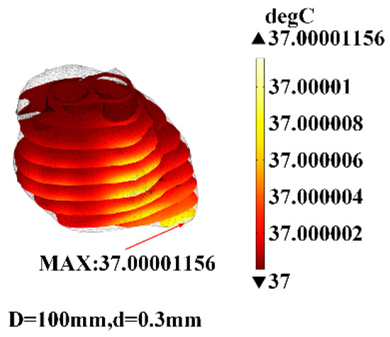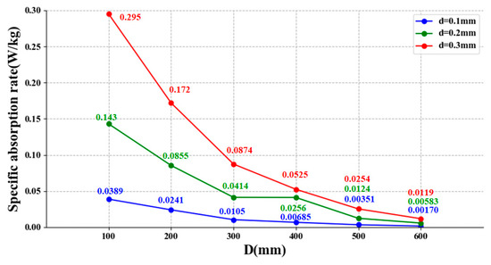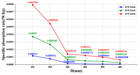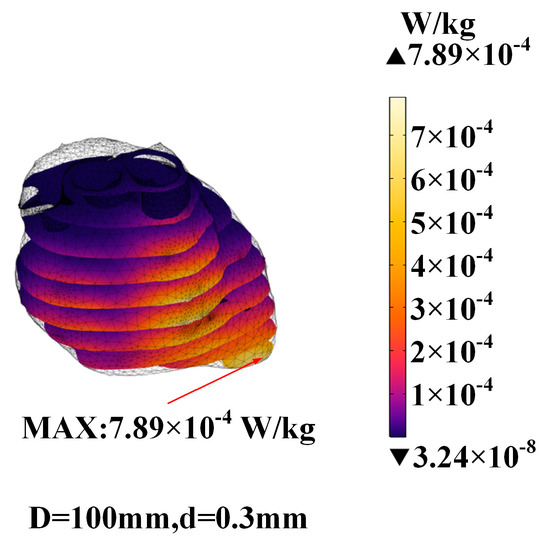 - Heart tissue: The SAR10g value and temperature increase in the heart tissue were lower than those of the thoracic tissue, and the change trends in the heart tissue were similar to those in the thoracic tissue. Under the most unfavorable conditions (distance of 100 mm and a 0.3 mm oven door gap), the maximum SAR10g value and temperature increase in the heart tissue were 0.000789 W/kg and 0.00001156 °C, respectively, which were far below the safety standard recommended by ICNIRP. Although the SAR10g of the human thoracic cavity and heart tissue for a single exposure was below the safety standard recommended by ICNIRP, long-term exposure could have led to electromagnetic energy accumulation in the tissue, potentially causing health risks [31].