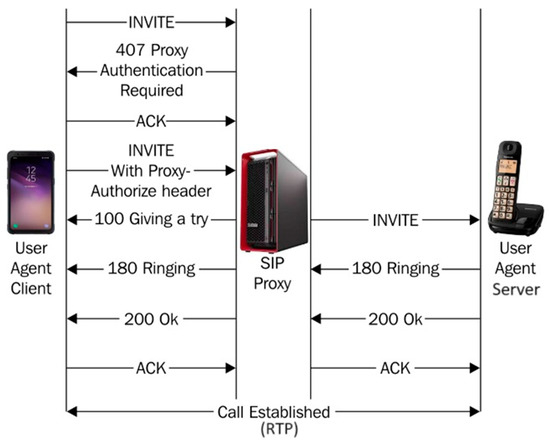 - Rosenberg, J.; Schulzrinne, H.; Camarillo, G.; Johnston, A.; Peterson, J.; Sparks, R.; Handley, M.; Schooler, E. SIP: Session Initiation Protocol; RFC 3261; Internet Engineering Task Force: Fremont, California, USA, 2002. [Google Scholar]