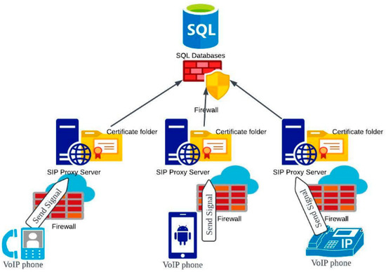 We implemented a realistic framework, as shown in Figure 4, to verify the practicality of the proposed mechanism and analyze its performance. The fundamental idea is comparable to that of a SIP proxy server that is commonly deployed. In order to establish a call session, each SIP proxy server provides authentication, grants access, and routes call setup signals to other servers where the callee is registered. Additionally, each SIP proxy server contains a directory that houses all user certificates, including the public key. The database containing information on SIP servers, agents, and related data is protected by a firewall. Communication ports have been modified to help prevent attacks targeted to compromise standard SQL and SIP settings. VoIP end devices register with the SIP proxy server over the Internet and set up a Transport Layer Security (TLS) tunnel before sending SIP signals. Additionally, each VoIP end device has a private key stored in secure memory.