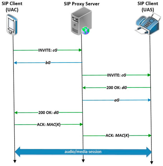 As shown in Figure 5, the caller sends a SIP invite message containing his/her ephemeral public key cG. A SIP proxy server checks its database and the directory containing public keys. If the callee exists, the SIP proxy server will respond to the caller with the callee’s static public key (bG) and forward the INVITE message to the callee. After receiving the INVITE message, the callee will reply with a SIP 200 OK message including his/her ephemeral public key dG. The SIP proxy server will return the caller’s static public key (aG) to the callee and transfer the 200 OK message to the caller. The caller uses the callee’s temporary and static public key received from the SIP proxy server paired with its own long- and short-term private key to calculate the Q-point. The session key K is then generated by hashing the extracted x-coordinate of the Q point. Finally, the caller sends the message authentication code of the session key MAC(K) which is produced by encrypting 16 bytes of zeros. The callee verifies the MAC by calculating the common session key.