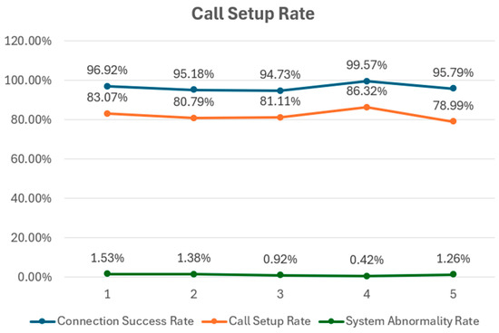 The proposed system was deployed in an organization with more than 200 employees. The statistical results of call establishment success are presented in Table 2. The author divided the status of calls into 12 categories. “Successful Call Setup” means that the communicating parties successfully conducted a conversation. “Missed Call” means the called party did not answer the call. “Line Busy” indicates that the callee’s line was currently in use or occupied. “Offline” means that the callee was not registered to the SIP proxy server. “Callee No Response” means that the SIP proxy server forwarded the INVITE signal to the callee, but the callee did not respond for some unknown reason. “Wrong Number” means the caller dialed a phone number that does not exist. “Call Rejected” means the callee hung up the phone directly. “Call Forbidden” means the callee’s account was illegal or the callee’s certificate did not exist. “System Service Abnormality” means that the SIP proxy server could not process SIP signals normally. “ACK timeout” refers to the situation where, after receiving an SIP 200 OK response, the system waited for the final SIP ACK signal for a duration that exceeded the specified time limit. “Unstable Network, Msg Lost” indicates that the SIP signal was lost or could not be successfully delivered due to unstable network conditions. All remaining cases are classified as “Other” status. The statistical data collection period was from 15 to 19 January. In order to evaluate the trend changes, the “Connection Success Rate” is defined as the following equation,