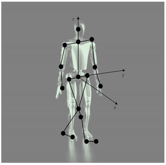 The human body model is characterized in the literature [10] in terms of 17 key joints, which include the head, neck, base of the spine, left and right shoulders, elbows, hands, hips, knees, ankles, and toes. According to the trajectory function of each part of the human body described by the biomechanical experimental data model, after correctly calculating the trajectories of each part of the human body during walking, the walking model of the human body can be constructed using these trajectories in order to calculate the positions of the 17 key joint points of the human body in the three-dimensional space. As shown in Figure 2, taking the base point of the spine as the origin, a coordinate system is established, and the positive direction is forwards, the positive direction is to the right, and the positive direction is upwards. The three-dimensional orientation of any part of the human body can be determined by the positioning of these 17 joints within the human body’s reference coordinate system. These translational and rotational kinematic parameters of the human body can be used to simulate human echoes.