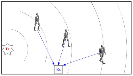 The entire simulation experiment scene is depicted in Figure 3. Within the room, a WiFi router (denoted as Tx) was positioned as the signal transmitter, while a signal receiver (denoted as Rx) was strategically placed to capture the transmitted signals. The transmission signal from the router Tx propagated radially from the transmission point. Upon encountering a human body, the signal underwent scattering. A portion of these scattered signals was subsequently received by the receiver Rx. The WiFi signal scattered back by the human body was treated as a wave source by the receiver. Different behavior patterns of the human body caused relative displacement changes between the wave source and the receiver, resulting in frequency changes in the scattered echo. This means that, when the human body makes a certain action under WiFi coverage, the receiver can obtain the Doppler effect changes corresponding to different behavior patterns of the human body.