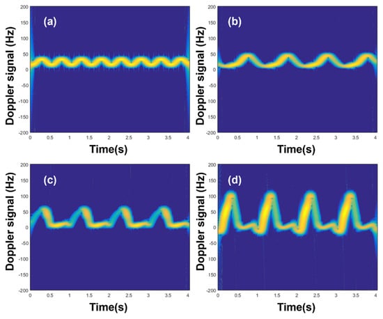 Micro−Doppler characteristics of pedestrians at different heights and walking speeds, different colors represent different magnitudes of values: (a) height , relative velocity ; (b) height , relative velocity ; (c) height , relative velocity ; and (d) height , relative velocity