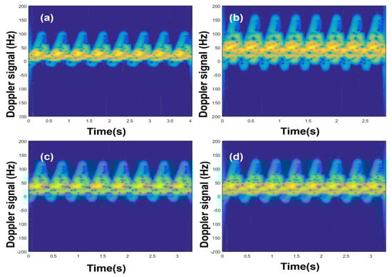 The overall micro-Doppler characteristics of different pedestrians during walking are further analyzed, and the overall micro-Doppler characteristics are actually the integrated Doppler histories of each part of the human body during a given observation time. Figure 5a,b show the overall micro-Doppler characteristics of pedestrians at height and relative walking speeds of , respectively. When the walking speed increases, the maximum micro-Doppler amplitude increases accordingly, while the gait period becomes smaller, and the overall micro-Doppler characteristics of the pedestrians are more sensitive to changes in speed. Figure 5c,d show the overall micro-Doppler signatures of pedestrians at a relatively high walking speed of and heights of , respectively. When the heights are relatively high, the maximum amplitude of the micro-Doppler becomes slightly larger, and the gait cycle is closer, so the overall micro-Doppler signatures of pedestrians are less sensitive to changes in heights. Through the comparative analysis, it can be seen that the micro-Doppler features clearly portray the movement characteristics of different pedestrians and carry the characteristic information of human body movement, which further confirms that WiFi signals and the extraction of micro-Doppler features can be used to classify and identify the human body and its behaviors.