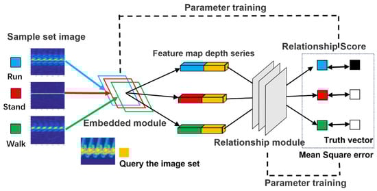 The relational network model was mainly composed of an embedded module and a relational module. Firstly, we input the support set samples of the known category label and the query set samples of the unknown category into the embedded module at the same time and generated the corresponding feature maps of the two categories, separately. Then, the feature map was input into the relation module to generate the relation score, which could represent the similarity between the support set samples and the query set samples. Finally, by comparing the relation scores, the support set sample labels corresponding to the highest scores were used as the prediction categories of the query set samples.