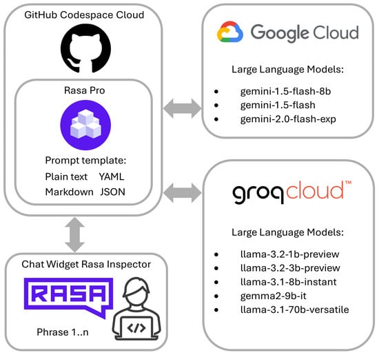 In this study, a telecommunications chatbot was developed using the Rasa Pro platform. The solution architecture, shown in Figure 1, includes the Rasa Inspector web application [24] designed for user interaction. The core of the system is the Rasa Pro platform, deployed in the GitHub Codespaces cloud environment [25], which has been integrated with other cloud environments such as Gemini API on Google Cloud [26] and Groq Cloud [27]. This integration provides the chatbot with access to a wide range of advanced language models, enhancing its capabilities and enabling the exploration of different AI/ML models.