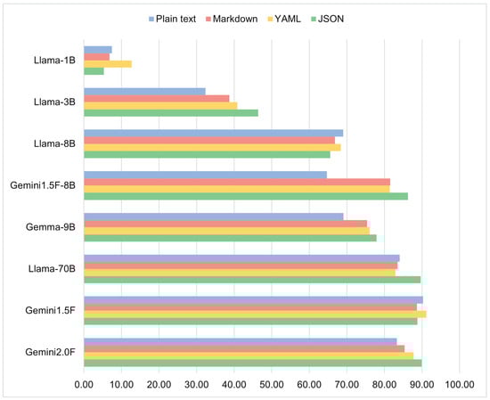 The analysis of the results shows that the YAML format often outperformed plain text, especially for smaller models, resulting in higher accuracy scores. The JSON format was effective for some models, particularly those of medium size. Significantly, Gemini1.5F-8B and Gemma-9B, despite their relatively small size, demonstrated strong performance after changing the prompt format and command precision. The “Precise” command was beneficial mainly for models that initially achieved lower results, but it did not always bring improvement for high-performing models. The largest models, such as Llama-70B, Gemini1.5F and Gemini2.0F, achieved the best results in the YAML and JSON formats, but changing the command to “Precise” was not always beneficial. The analysis of the results highlights the crucial role of prompt engineering in optimizing LLM performance. The choice of the appropriate prompt format and command can significantly impact the accuracy of smaller models, enabling them to achieve results comparable to larger models.