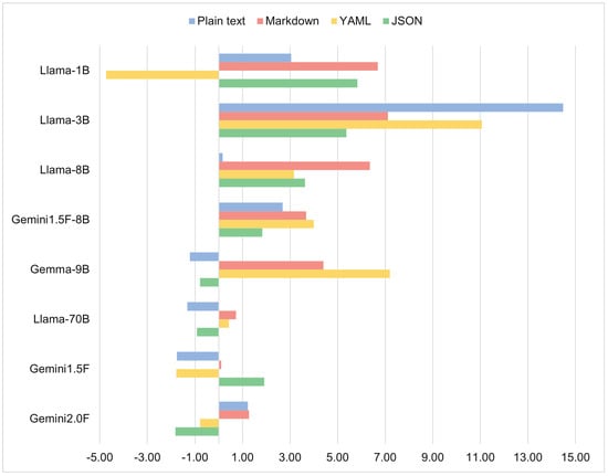 In Table 8 and Figure 3, the results of the experiments after changing the prompt command from “Concise” to “Precise” are presented. The analysis of the results shows that the prompt modification proved particularly effective for models that initially exhibited lower baseline accuracy, likely due to their tendency to generate more verbose responses. The most significant improvements were observed in the plain text format for Llama-1B (+3.04) and Llama-3B (+14.48). In the Markdown format, improvements were noted for Llama-1B (+6.68), Llama-3B (+7.11), and Llama-8B (+6.35). The YAML format showed varied responses, with significant improvements for Llama-3B (+11.07), Gemma-9B (+7.20), and Gemini1.5F-8B (+4.00), while Llama-1B (−4.73) and Gemini1.5F (−1.78) experienced a decrease in performance. In the JSON format, improvements were observed for Llama-1B (+5.83), Llama-3B (+5.36), Llama-8B (+3.63), and Gemini1.5F-8B (+1.83), while Gemini2.0F (−1.82) showed negative changes. Notably, Gemini1.5F-8B and Gemma-9B showed improvements with the “Precise” command in some formats.