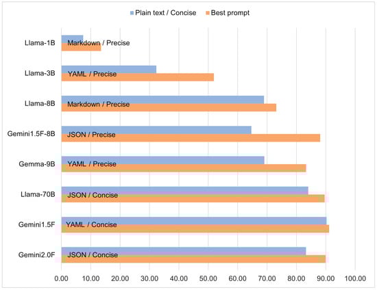 Table 9 and Figure 4 present a comparison of the effectiveness of the highest-performing prompts compared to “Plain text/Concise” commands for each LLM model. The smallest models, Llama-1B (13.50), Llama-3B (51.90), and Llama-8B (73.17), despite improvements, achieved ultimately low accuracy. In contrast, Gemini1.5F-8B (88.10) and Gemma-9B (83.28), despite their relatively small size, demonstrated surprisingly good results with the “JSON/Precise” and “YAML/Precise” formats, respectively. For the larger models, Llama-70B (89.64) and Gemini2.0F (89.92), changing the prompt format was beneficial, but changing the command did not help. The most mature model, Gemini1.5F (91.15), achieved the best results, but neither the format nor the final command had a significant impact on its performance.