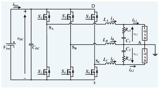 Distributed energy resources (DERs), such as solar and wind energy, are steadily gaining a larger share among the mix of energy sources used in today’s power systems [1,2,3,4,5]. However, the intermittency of DERs poses a significant roadblock to their successful integration with the existing utility grid infrastructure. The intermittent nature of DERs directly impacts their availability and reliability [6,7,8]. These challenges are mitigated by energy storage systems (ESSs), which provide energy-buffering capabilities. The energy stored in an ESS is typically delivered to the loads as AC voltage [4,7,8,9]. Specifically, residential and commercial consumers are powered by low-voltage AC. However, the energy storage devices that are typically used in an ESS, such as batteries, store electrical energy in DC form. Thus, the stored energy in DC form needs to be converted into the AC format by using an inverter. Moreover, the AC voltage generated by the inverter must comply with the local and national electrical codes [10]. According to the electrical codes, a typical North American residential power supply architecture comprises split-phase 120 V/240 V, 60 Hz AC voltage with a grounded neutral terminal. Therefore, the AC voltage generated by the inverter of an ESS must support the electrical grounding of the neutral terminal.