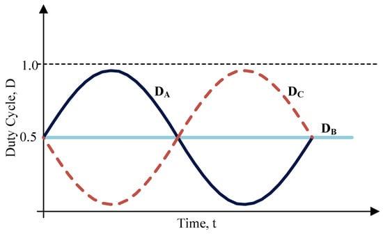 The conventional three-leg inverter, as shown in Figure 1, is used for generating split-phase AC voltage and is driven by using the sinusoidal pulse width modulation (SPWM) technique. The modulating signals used for SPWM are shown in Figure 2. Leg-1 ( and ) and Leg-3 ( and ) of the inverter are switched with sinusoidal modulating signals that are apart. These two legs are responsible for generating the two phase voltages, whereas Leg-2 ( and ) is switched with a constant duty cycle of . The primary purpose of the high-frequency-switched neutral leg is to provide a path for the unbalanced current [18,19,20,33]. The switching voltages appear at switching nodes , , and with respect to the negative terminal of the DC bus (marked by point E). The voltage waveform between the neutral (denoted by A) and E (denoted by ) has a common-mode switching component of the three legs [13,35,36]. This voltage waveform can typically have three voltage levels, as shown in Figure 3a. When the neutral point of the inverter is connected to earth ground, all the other circuits in the system that are referenced to earth ground, such as the control systems, gate drive circuits, APS, etc., experience the high-frequency switching component of the CM voltage. One of the main effects of this CM voltage appearing across any isolation barrier is that currents of significant magnitude flow in the ground loops. The leakage currents in the ground loop appear due to the high-frequency CM voltage appearing across the neutral and the negative terminal of the DC bus. The CM voltage has a quasi-square voltage waveform, as shown in Figure 3a, consisting of four levels. The four levels of the square waveform are 0 V, , , and , which appear for different time durations in a switching cycle throughout the line cycle. The average value of the CM voltage is in each switching cycle. The switching-frequency component of the CM voltage is filtered by the addition of the proposed split DC-bus capacitors, and , between the neutral and DC-bus terminals, as shown in Figure 3b. These capacitors, together with the filter inductors, form a second-order filter for voltage . The values of the capacitors are chosen such that this filter provides a significant decrease in the high-frequency component of voltage . As a result, this voltage contains an AC component of small magnitude and a significantly high DC component. Since the neutral leg is always switched with a duty cycle of , the voltage of the middle point of the split capacitors is forced to remain at a voltage level of . The middle point voltage of the split DC-bus capacitors does not drift over time, as there is no load across the split DC-bus capacitors. These capacitors are used for filtering high-frequency voltage . Therefore, the middle point of the capacitor ties earth ground to a DC voltage level with respect to point E, i.e., earth ground is tied to . Consequently, the voltage across the isolation barrier is effectively DC voltage, thereby achieving a significant reduction in the magnitude of the switching-frequency current flowing through the isolation capacitance.