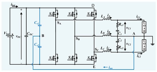 Conventionally, the DC voltage of a battery is converted into split-phase AC voltage by using a single-phase inverter connected to a low-frequency transformer [11,12]. The transformer is connected at its primary winding to the single-phase inverter and generates two phases of output on its secondary windings. The secondary windings of the transformer are connected such that the two phases are apart and the common point becomes the neutral terminal. Since the split-phase voltage generated by a transformer is isolated from the inverter, the neutral terminal can be connected to ground without any significant parasitic ground currents affecting the inverter. However, a low-frequency transformer is undesirable in this application due to its bulky size and large weight, which lead to low power density of the inverter. The low-frequency transformer can be eliminated in this application by using a three-leg full-bridge inverter that is driven by using sinusoidal modulating signals [13,14,15,16,17,18,19,20]. Due to the switching action of the inverter, high-frequency common-mode (CM) voltage develops between the AC terminals and the terminals of the DC bus. When the neutral terminal of the AC is connected to earth ground, large currents flow through the insulation and isolation capacitance of various components of the inverter, which can lead to the failure of the inverter.