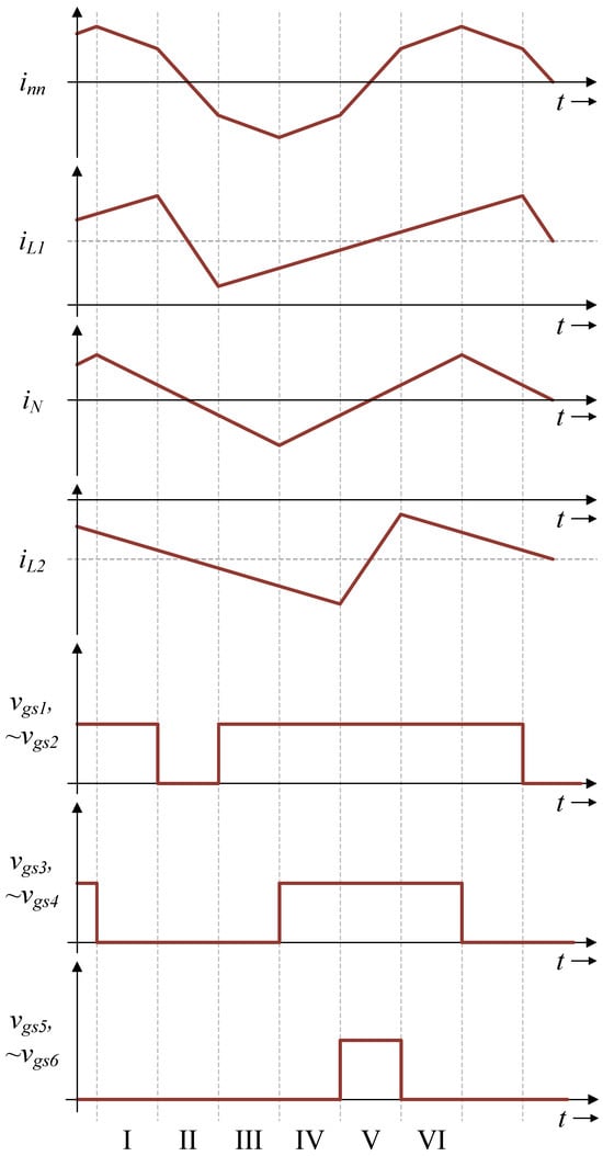 Key waveforms describing the effect of split DC-bus capacitors on the operation of the proposed circuit and current . Voltages – correspond to the gate-source voltages of switches –.