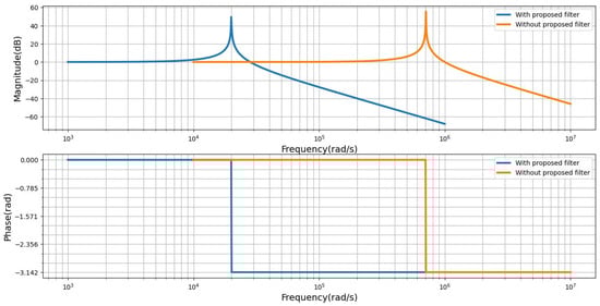 Bode plot showing the attenuation of the introduced filter compared with the case without filter.