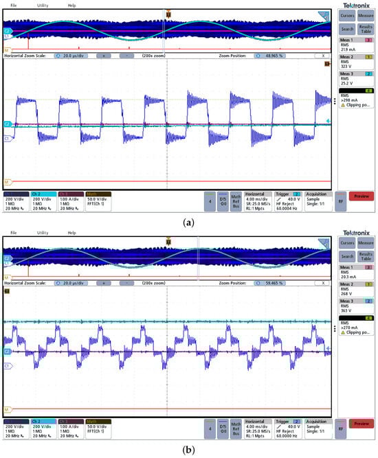 Experimental waveform for conventional split-phase inverters at different times in a line cycle, (a) Near zero crossing of inverter AC terminal voltage, (b) Near peak value of inverter AC terminal voltage. In all the above waveforms, light blue: line voltage, , 100 V/div.; dark blue: CM voltage, , 200 V/div.; pink: current, , 5 A/div.