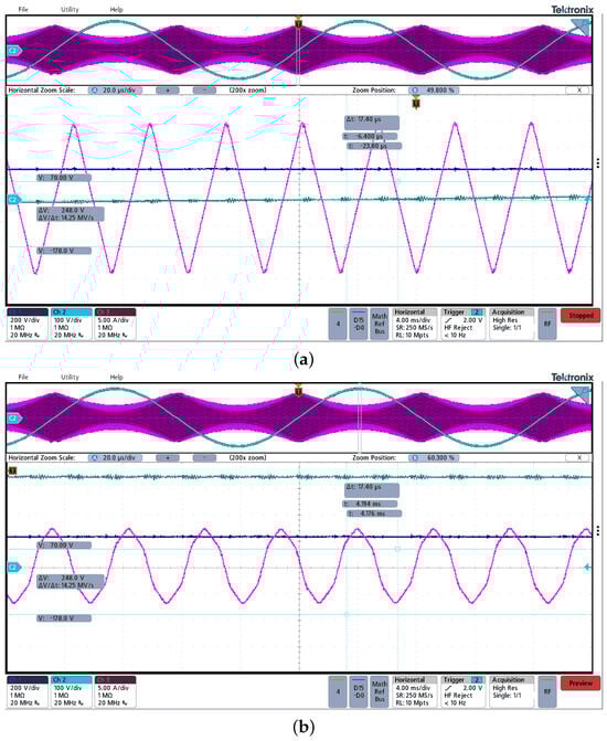 Simulation and experimental studies were conducted on a 12 kW three-leg full-bridge inverter prototype. A DC-bus voltage of around 400–500 V was used to generate a sinusoidal 240 V/120 V, 60 Hz AC voltage. The experiments were performed with balanced split-phase resistive loads ( and ) connected to the inverter AC terminals. However, the type of load connected to the inverter, i.e., resistive, inductive, or capacitive, does not affect the CM voltage waveforms, as the load does not appear in the CM equivalent circuit (as shown in Figure 3b). Only those elements that are connected between the AC terminals and DC-bus terminals participate in the common-mode circuit. The major circuit parameters are listed in Table 1. The split capacitors used in the inverter were realized by using a bank of two parallel capacitors (part number MKP1848C62580JP4) for each and . The issue regarding the CM voltage, , in the conventional full-bridge inverter of Figure 1 is illustrated in Figure 3c. Figure 7a shows a nearly square voltage waveform around the zero crossing of AC voltage. Similarly, Figure 7b shows a stepped voltage waveform near the peak of AC line voltage. The four levels of the waveform are 0 V, , , and . In both these waveforms, the current, (pink), is zero, since there is no connection.