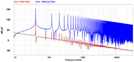 Although an improvement in attenuating CM voltage is achieved in the simulation study presented here, the presence of parasitic elements in the inverter components will reduce the amount of attenuation achieved. Multiple parasitic elements were incorporated in the simulation study, such as the capacitance of wire and cable insulation, the parasitic capacitance of semiconductor packaging, and the equivalent series resistance (ESR) of the capacitors (2X capacitor part number R463W515050H7M; 5 mΩ) and the inductors (custom inductor with key parameters of 220 μH, 50Arms, and = 8 mΩ was used). The parasitic capacitance of insulation and component packaging were modeled by a lumped capacitor, , as was shown in the Analysis section. The ESR values of the capacitors and the inductor were also modeled by using lumped resistance connected in series with the respective components. A few key parasitic elements that affect CM noise performance, which were neglected in this paper, are the inter-turn capacitance of the inductors, the inductance of the capacitors, the voltage and frequency dependence of the capacitance value of the capacitors, etc. [25].