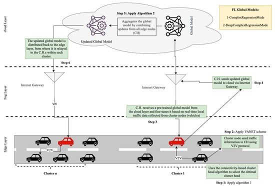 To adapt to changing traffic conditions, CHs perform continuous local fine-tuning before synchronizing updates with the fog layer. This hierarchical learning structure—where updates are refined progressively from CHs to fog nodes and then aggregated at the cloud layer—ensures that model adjustments remain regionally consistent while preserving the benefits of localized learning.