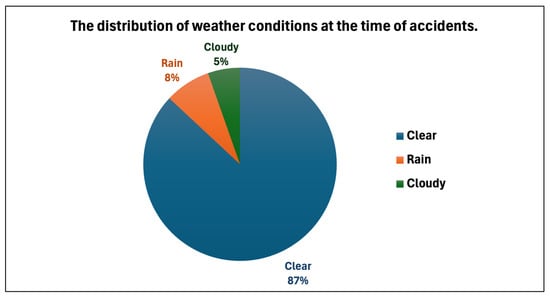 The distribution of weather conditions at the time of accidents.