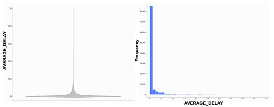 Figure 6 presents the violin and histogram plots for Average Delay. It reveals a highly skewed distribution, with most data points concentrated near zero. Both visualizations demonstrate that minimal delays are the most common, while significant delays are rare and represented by a long tail extending toward higher values. This skewness highlights the need for preprocessing to handle outliers and normalize the data for model training.