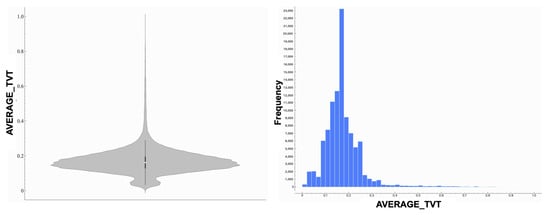 Figure 7 shows the violin and histogram plots for Average Travel Time (TVT). It illustrates a moderately skewed distribution, with most data points clustered between 0.20 and 0.30 units. The violin plot shows a dense central region, while the histogram highlights the declining frequency as travel times increase. A long tail in both visualizations indicates occasional higher travel times.