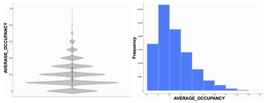 Figure 9 shows the violin and histogram plots for Average Occupancy. It demonstrates a compact, skewed distribution, with most values concentrated near the lower end of the scale. The violin plot highlights the density of low-occupancy values, while the histogram shows a steady decrease in frequency as occupancy rates increase. This distribution reflects typical road usage, with occasional periods of high occupancy due to congestion.