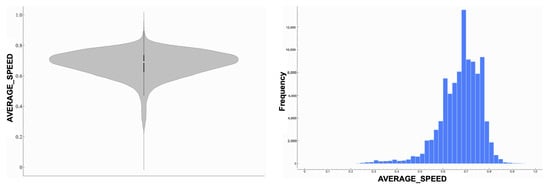 Finally, Figure 10 presents the violin and histogram plots for Average Speed. It indicates a relatively symmetric and normal-like distribution, with most data points centered around the mean speed. Both visualizations show minimal variability and a balanced spread of values, suggesting consistent traffic flow in most scenarios, with fewer deviations toward extreme speeds.