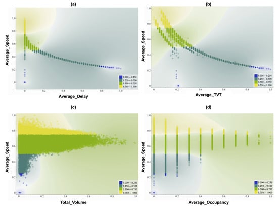 Relationship between input variables and Average Speed: (a) relationship between Average Delay and Average Speed, (b) relationship between Average Travel Time (TVT) and Average Speed, (c) relationship between Total Volume and Average Speed, and (d) relationship between Average Occupancy and Average Speed.
