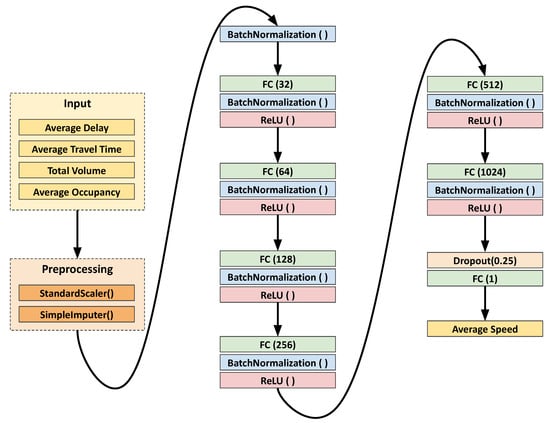 As Figure 12 demonstrates, the VehiCast model architecture is designed to process real-time highway traffic data and accurately predict average speed. The model starts with an input layer that takes four key traffic variables: Average Delay, Average Travel Time, Total Volume, and Average Occupancy. To ensure consistent and reliable data input, the preprocessing stage applies two methods: StandardScaler(), which standardizes each feature by removing its mean and scaling it to unit variance, ensuring that all features are on the same scale and improving model performance, and SimpleImputer(), which handles missing values by replacing them with a designated statistical value (such as the mean or median of the feature), maintaining data integrity and avoiding disruptions during model training. The model’s core consists of multiple fully connected (FC) layers with progressively increasing neuron counts (32, 64, 128, 256, 512, and 1024), allowing the model to capture increasingly complex relationships within the input features. Each layer is followed by batch normalization to stabilize learning by normalizing layer inputs and by ReLU activation functions to introduce non-linearity, enabling the model to learn complex patterns. A dropout layer with a 0.25 rate is applied to reduce overfitting before the final FC layer, which outputs the predicted Average Speed as a single numerical value. This architecture effectively balances complexity and regularization for real-time highway traffic incident forecasting, ensuring accurate and reliable predictions.