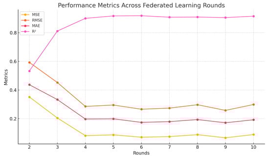 Figure 13 shows the progression of key metrics (MSE, RMSE, MAE, and ) across the 10 federated rounds, demonstrating the model’s performance improvements and stabilization over the training process. As illustrated in Figure 13, the early rounds exhibited significant improvements in the model’s performance metrics as the global model started to learn from decentralized data. For instance, in Round 2, the model achieved an MSE of 0.3517, an RMSE of 0.5930, and an MAE of 0.4372. The value is 0.5330, indicating that the model could explain 53.3% of the variance in the data, representing a substantial improvement over the initial untrained state. By Round 3, the metrics had significantly improved, with the MSE dropping to 0.2049, the RMSE reducing to 0.4526, and the MAE declining to 0.3334. The value increased sharply to 0.8116, demonstrating that the model could now explain over 81% of the data variance, a notable milestone in predictive accuracy. In Round 4, the model exhibited even more potent performance, with the MSE decreasing further to 0.0815, the RMSE to 0.2855, and the MAE to 0.1975. The value surged to 0.9004, indicating that the model was able to explain 90% of the variance. This marked a critical turning point where the model achieved high accuracy, suitable for practical applications.