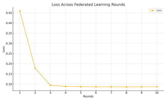 The aggregate evaluation metrics across all clients further validate the federated learning approach. Figure 14 shows the decline in loss values as the training progressed over 10 federated rounds, illustrating the model’s convergence and optimization during the learning process. The average loss decreased significantly from 0.4588 in Round 1 to 0.0869 in Round 10, reflecting steady and effective optimization throughout the training process. This reduction demonstrates that the global model successfully integrated insights from the decentralized datasets while preserving data privacy.
