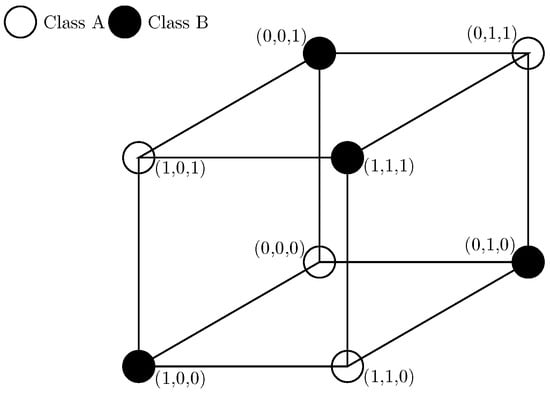 Representing the XOR function is a fundamental problem for neural networks (NNs), as it involves solving a nonlinearly separable classification problem. Unlike other problems represented by logical functions with two-bit inputs, the XOR problem requires the use of two layers of neurons [1]. The parity function extends the XOR function from 2 to N inputs, forming a proportionally challenging binary classification problem for inputs, an illustration of which in the 3-dimensional space () is depicted in Figure 1. According to the universal approximation theorem, any function, including the parity function, can be represented by a deep NN. However, it is always preferable to employ an NN architecture with minimal cost in terms of the number of synapses, neurons, and layers. Another key consideration is the morphology of the solution landscape, as well as the representational capacity and extrapolation capabilities of the chosen NN model. An optimal NN architecture using perceptrons with one hidden layer of size N is described in [2,3], while a modular NN architecture is presented in [3], and a single product unit approach is discussed in [4].